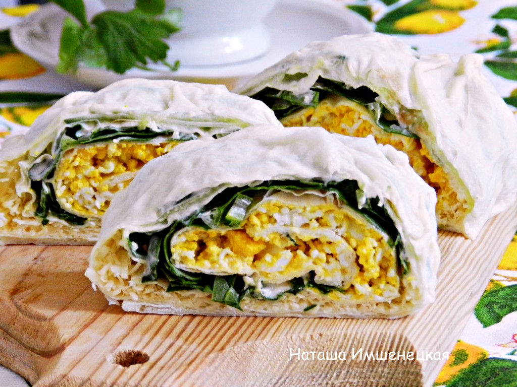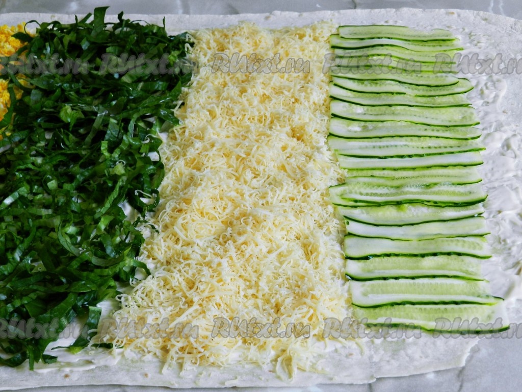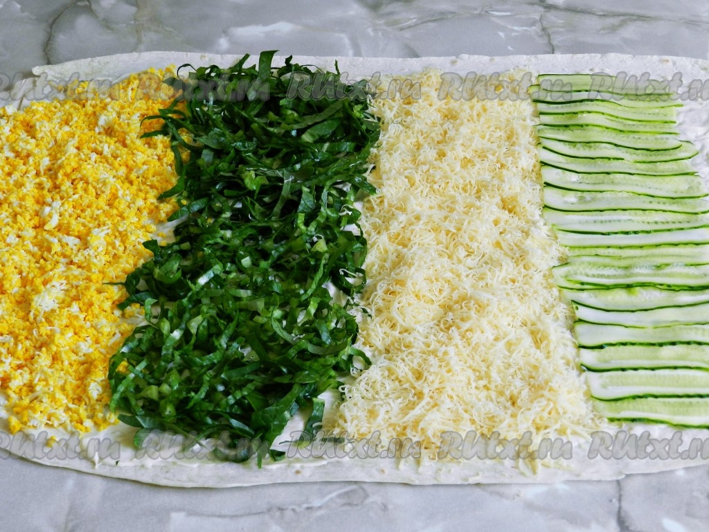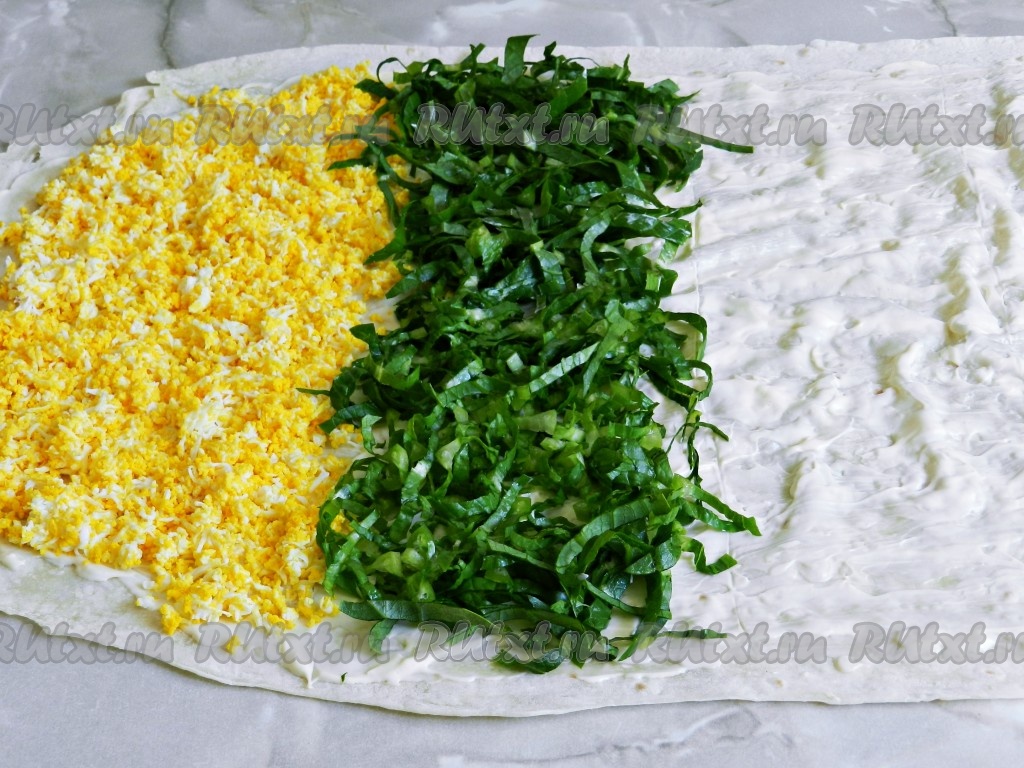 Лаваш разделить визуально на 4 примерно равные полоски. Первой полоской выложить натертые яйца, рядом разложить нарезанные листья салата.