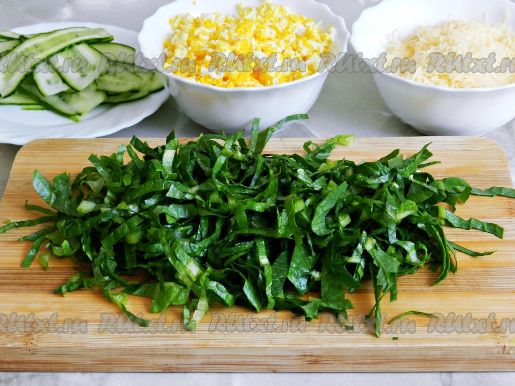 Тонко нарезать листья салата.