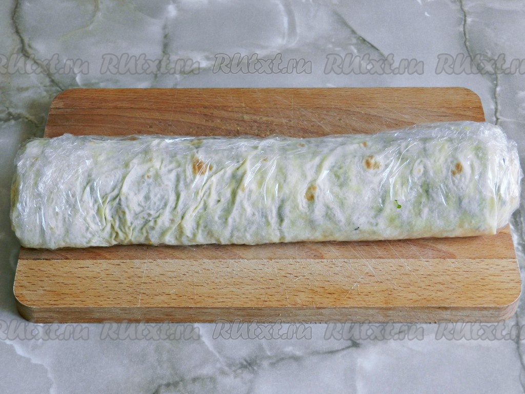 Лаваш аккуратно свернуть рулетом, подвернув края на начинку.
