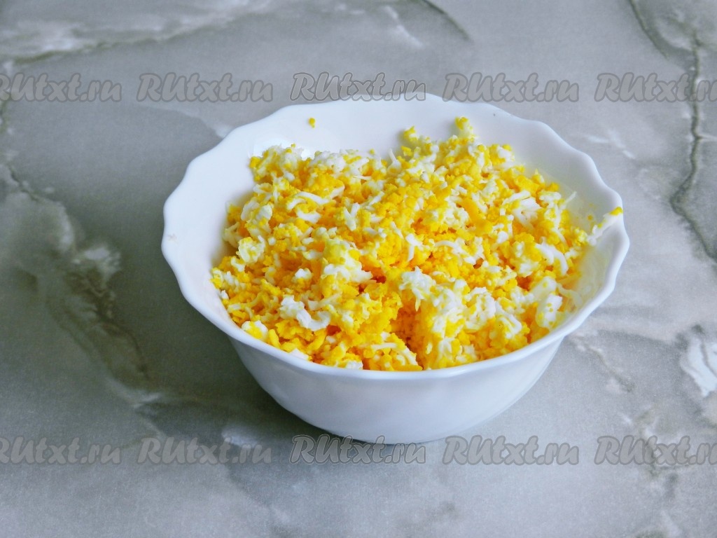Яйца, сваренные вкрутую, очистить и натереть на терке.