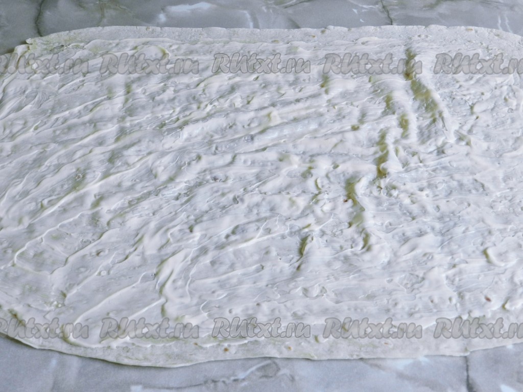 Лаваш, разложив на столе, смазать тонким слоем майонеза, оставляя края не смазанными.