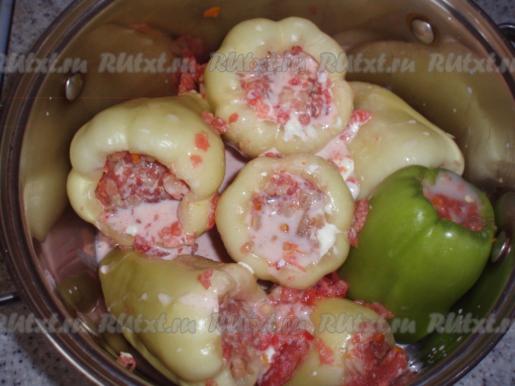 Подготовленные перцы начинить фаршем. Сложить подготовленные перцы в кастрюлю.