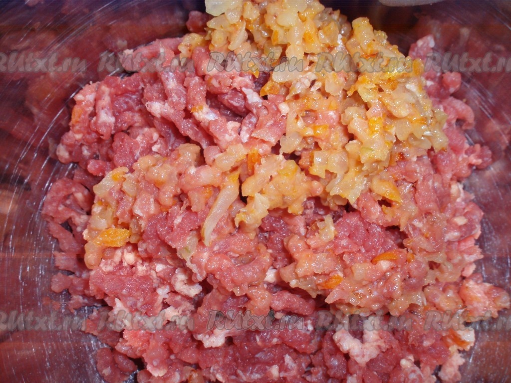 Лук мелко нарезать. Морковь натереть на крупной терке. Обжарить лук и морковь на растительном масле, иногда помешивая, до мягкости. Мясо вымыть, очистить от пленок, перекрутить на мясорубке вместе с обжаренными луком и морковью.