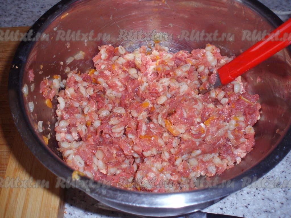 К получившемуся фаршу добавить сваренную перловку. Кстати, варить перловку очень удобно в мультиварке на программе «Молочная каша».