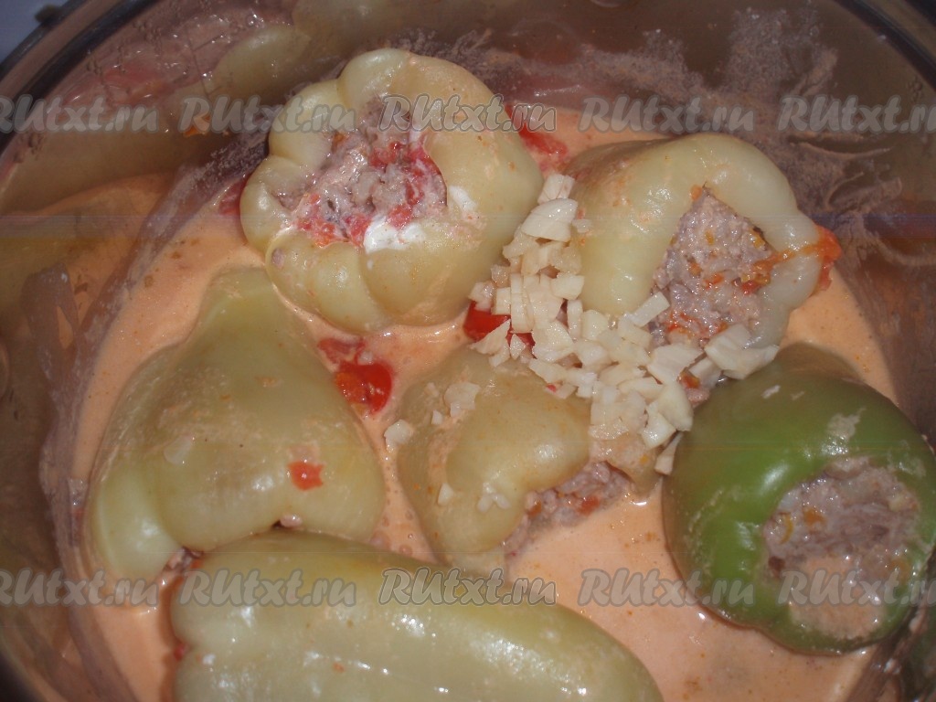 Примерно за 10 минут до готовности чеснок измельчить и добавить к перцу.
