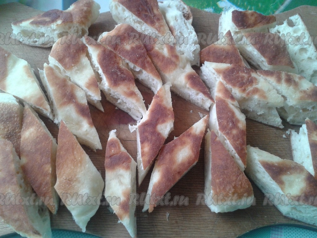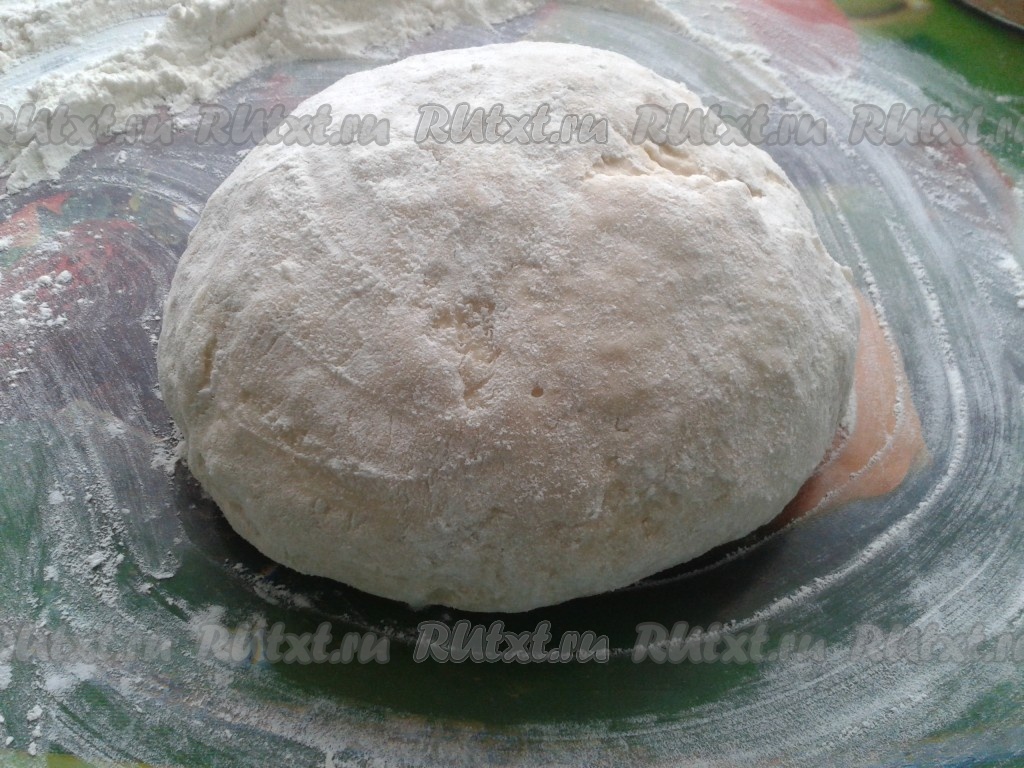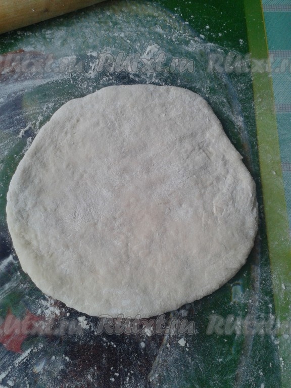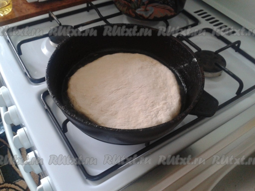После замеса тесто нужно оставить на 30 минут, чтобы подошло (желательно в теплое место). После того как тесто подойдет, его нужно разделить на 5 частей (можно на 6, зависит от размера сковородки, у меня большая сковорода) и раскатать каждую часть в круг толщиной 1,5 см.
