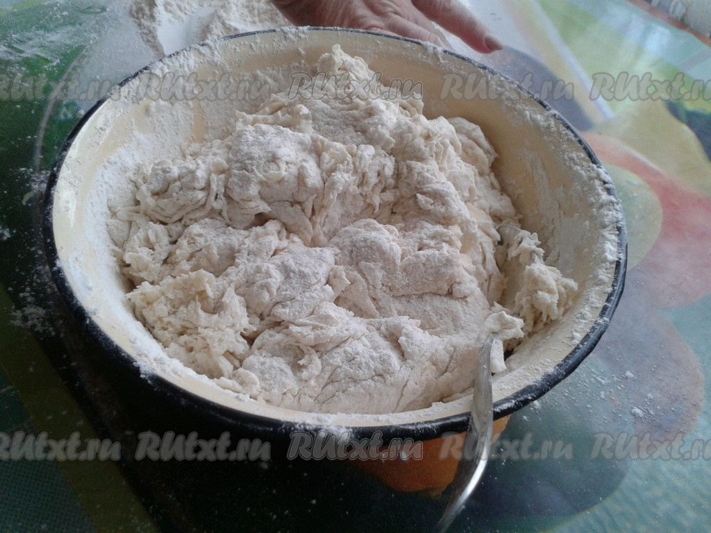 Когда тесто станет очень густым, его дальше нужно выложить на стол, посыпанный мукой, и вымесить руками. Как только тесто перестанет липнуть к рукам, значит оно готово. Главное тесто не забить сильно мукой, иначе коржи получатся резиновыми.