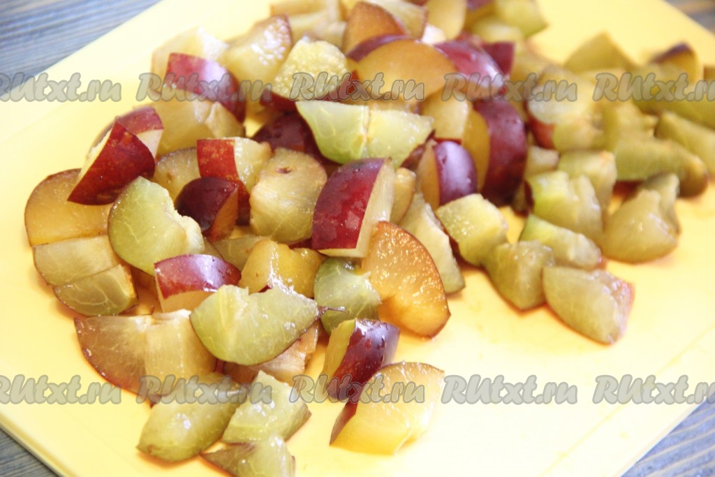 Сливы разрезать пополам, удалить косточки, а затем нарезать на кубики.