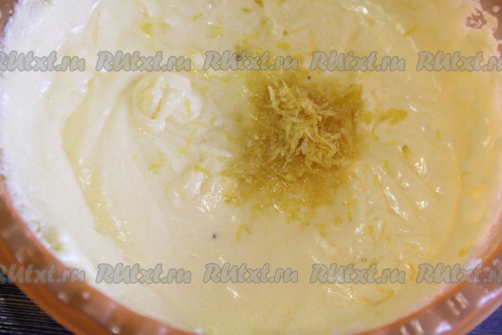 Лимон хорошо вымыть и обдать кипятком. Снять с лимона цедру и добавить в тесто. Затем выдавить из лимона 3 столовые ложки сока и добавить в тесто, хорошо перемешать.