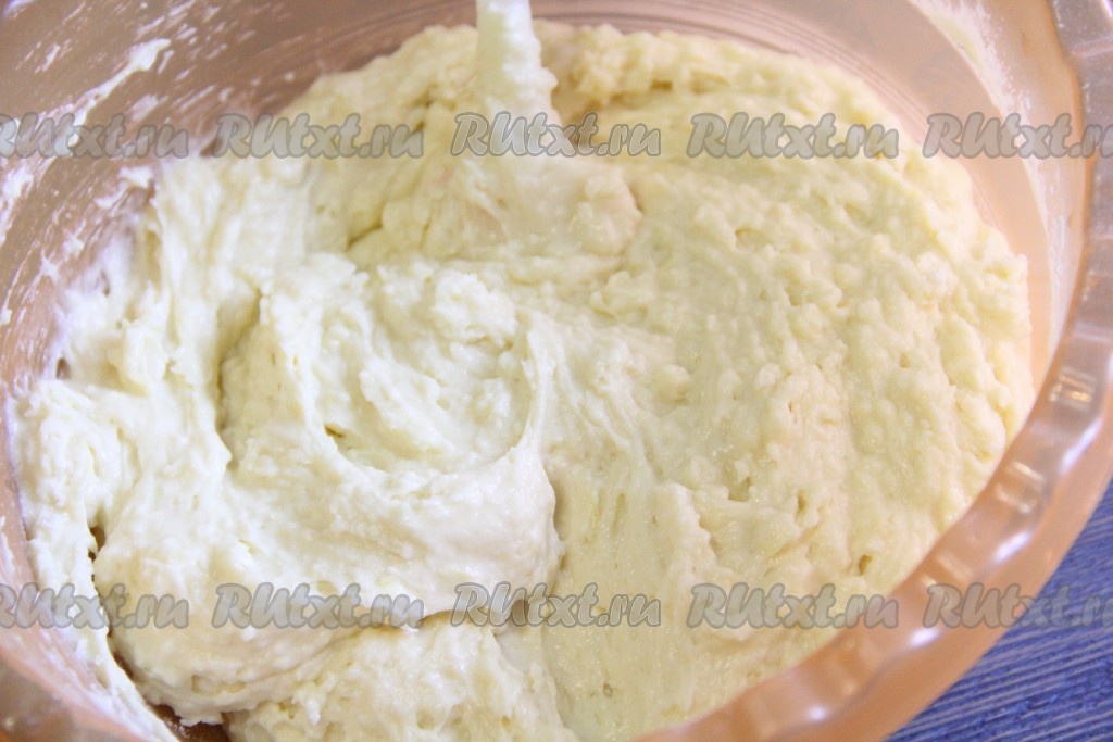 Перемешать тесто силиконовой лопаткой. Тесто получится в меру густым и однородным.