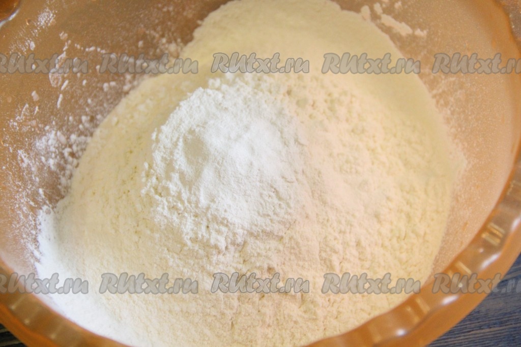 Муку просеять, соединить с солью и разрыхлителем.