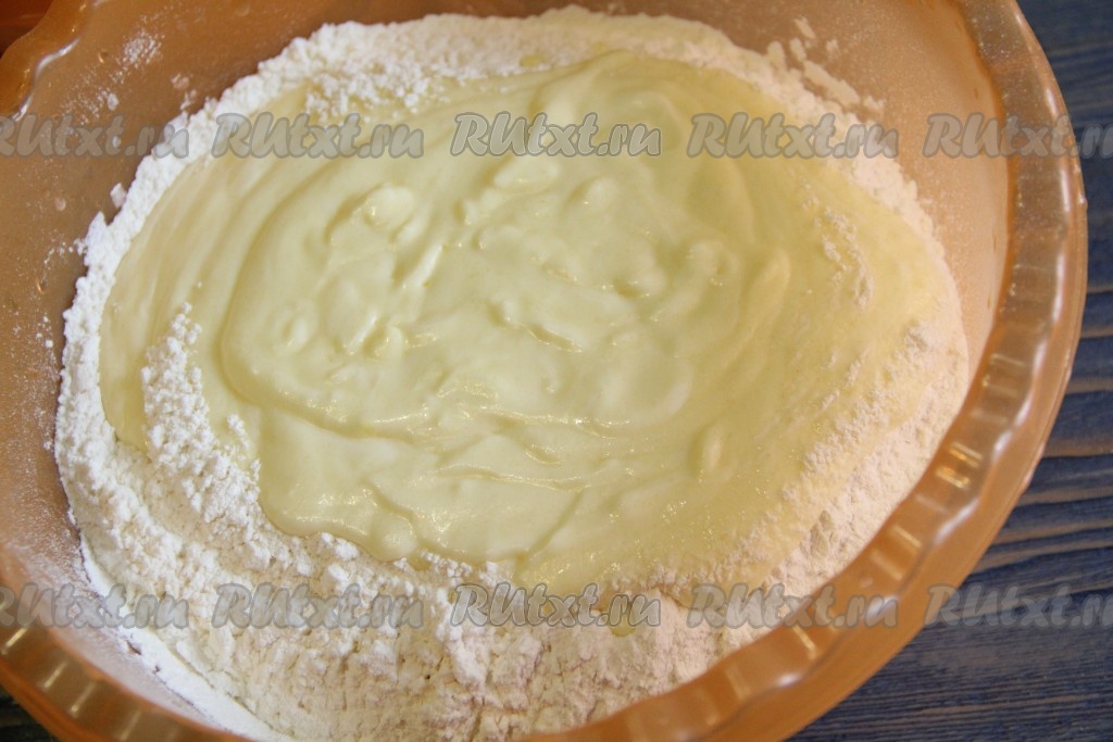 Муку, смешанную с солью и разрыхлителем, всыпать в тесто.