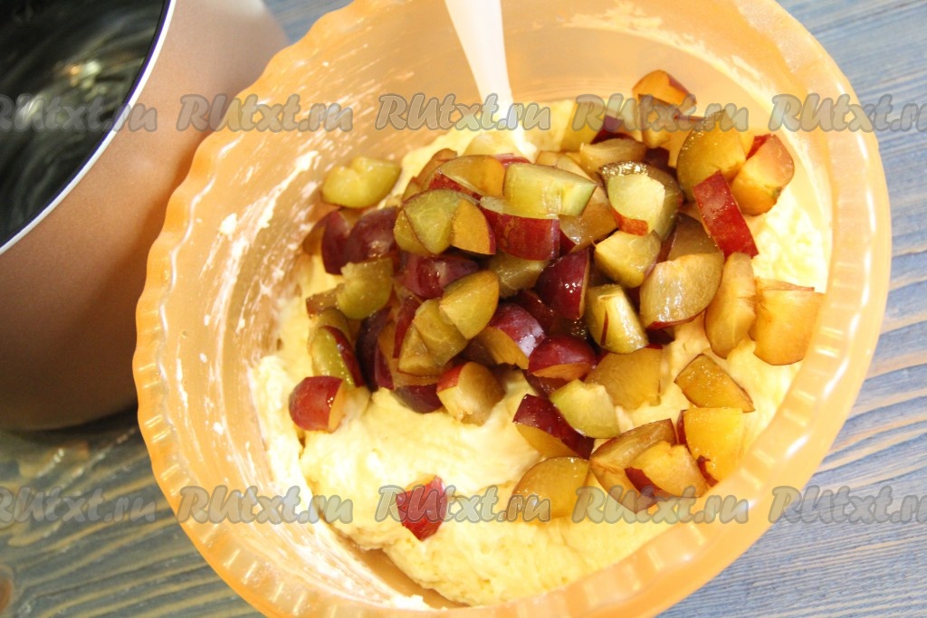 Добавить кусочки слив в тесто и аккуратно перемешать.