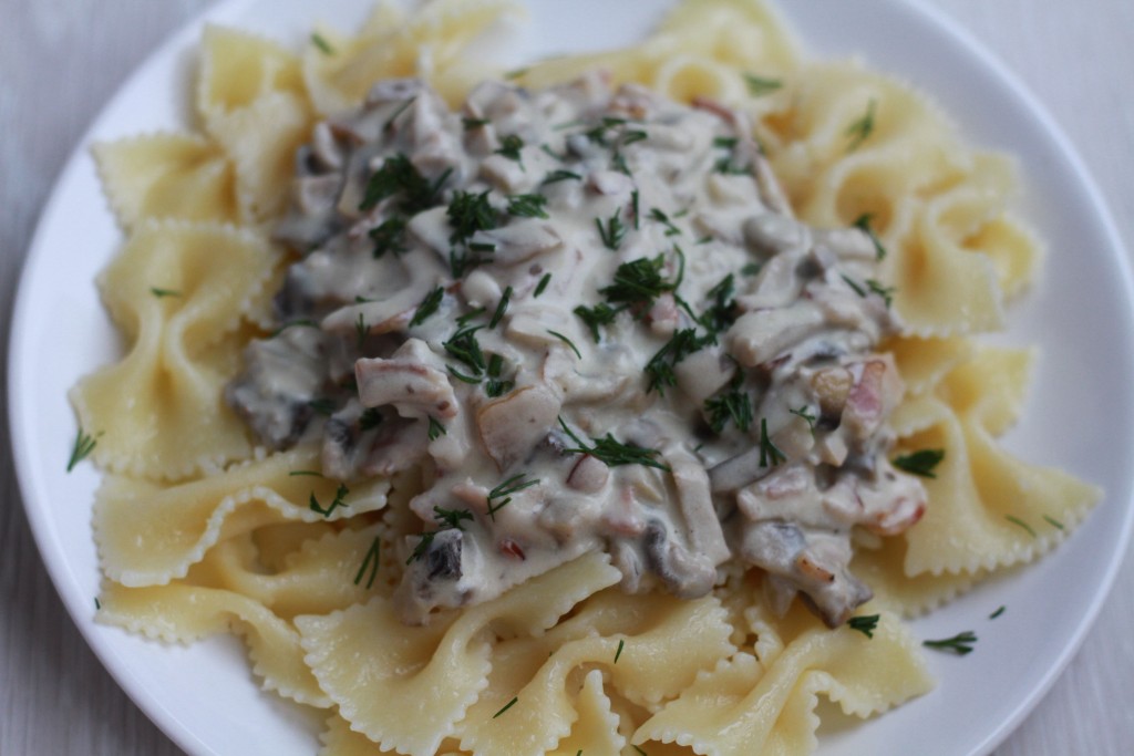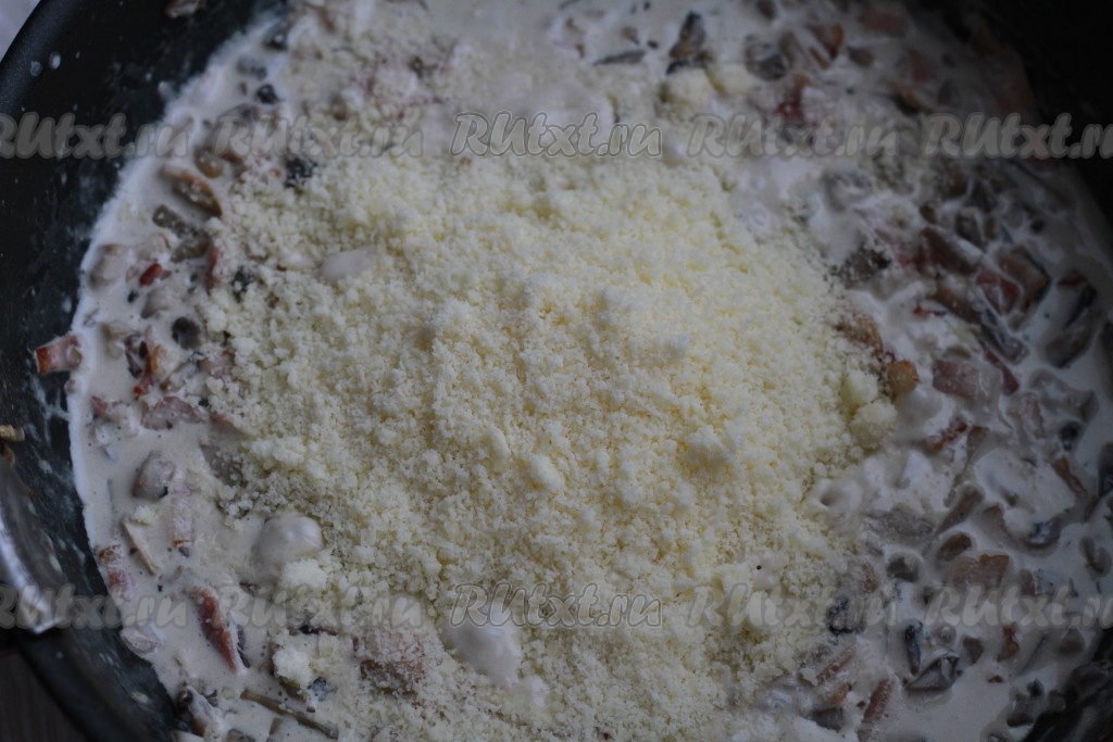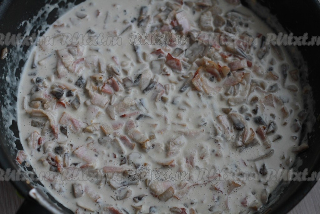 Грибы и бекон залейте сливками и на медленном огне продолжайте готовить соус, постоянно помешивая. Ждём, пока сливки загустеют, не допуская кипения.