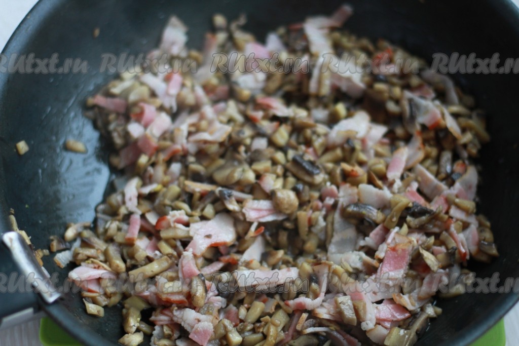 К грибам отправьте нарезанный бекон, немного обжарьте.