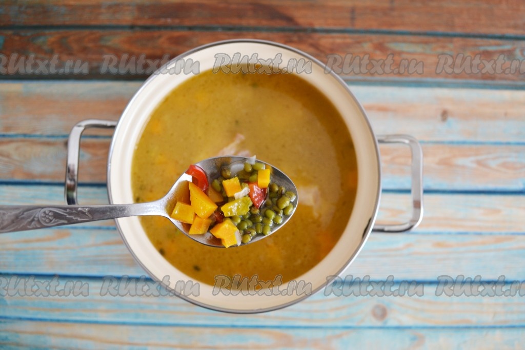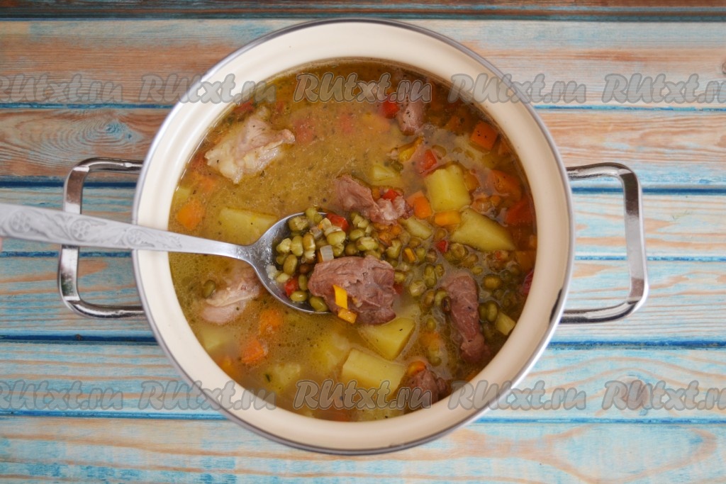 С маша слить воду и переложить к нему мясо с овощами, обжаренные на сковороде. Залить водой и поставить на огонь. После того как вода закипит, огонь снизить к минимуму и продолжать варить суп 30 минут.