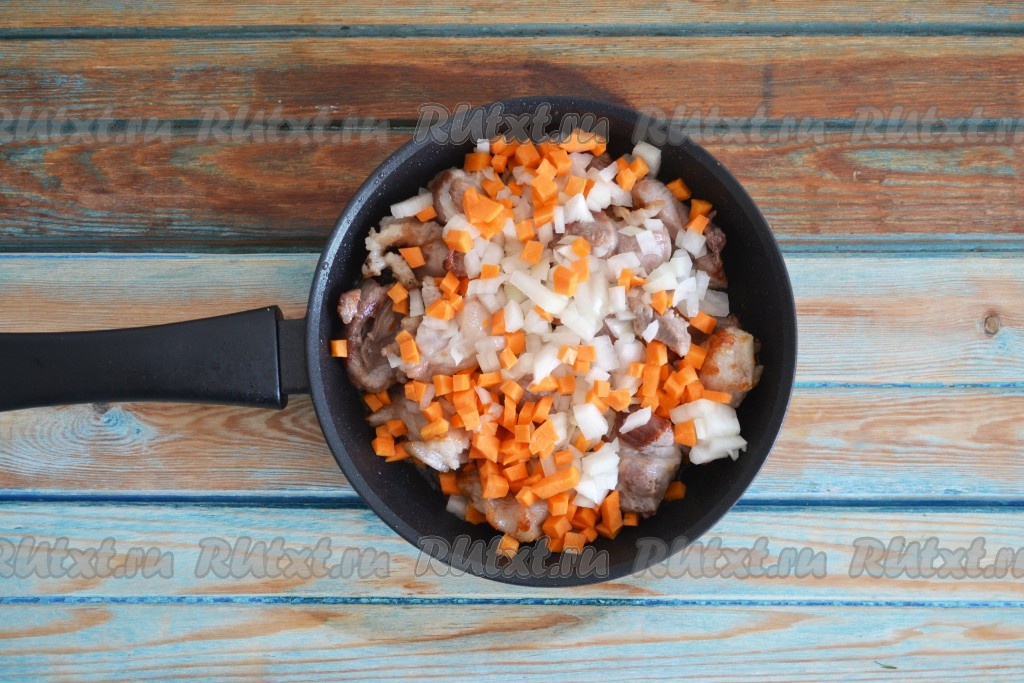 Лук и морковь очистить, нарезать мелкими кубиками и выложить в сковороду поверх мяса.