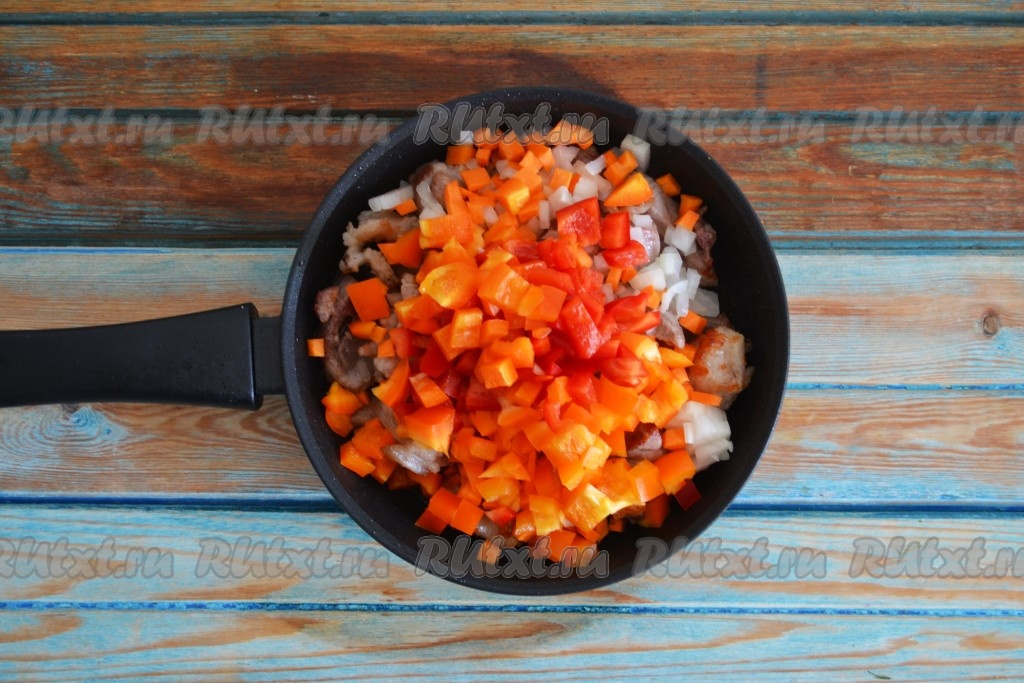 Сладкий перец вымыть, разрезать и удалить сердцевину, семена и белые волокна. Нарезать перец небольшими кубиками, добавить в сковороду, перемешать и обжарить вместе с мясом и остальными овощами еще 2 минуты, иногда помешивая.