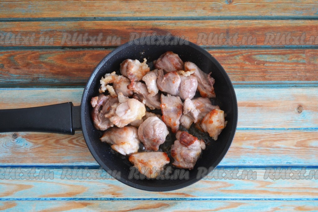 Мясо вымыть и нарезать на небольшие кусочки. Сковороду поставить на огонь, нагреть и влить масло, через минуту выложить кусочки мяса. На сильном огне обжарить мясо со всех сторон до румяной корочки.