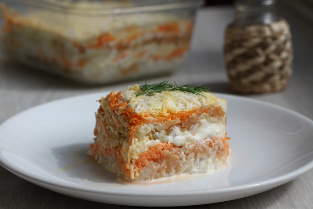 Повторите все слои, не забывая промазывать майонезом: лук, яблоко, яйцо, морковь, сыр.
