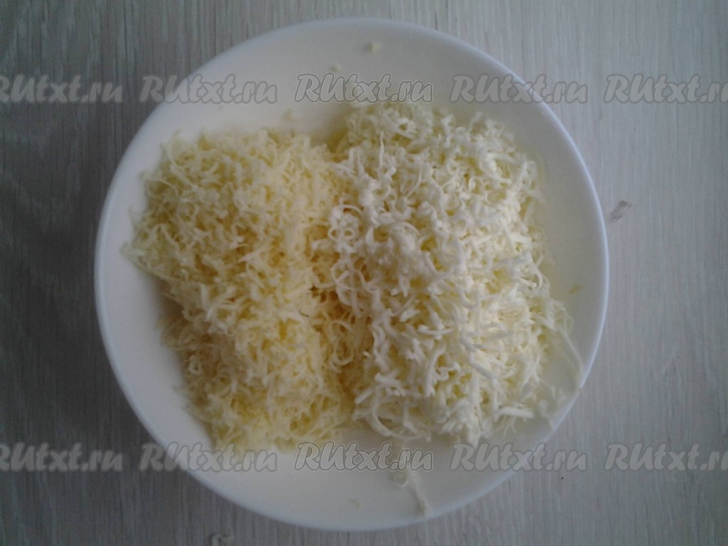 Сыр натрите, используя крупную терку (я использую два вида сыра, один из них - плавленый сыр "Дружба", который я предварительно замораживаю, чтобы легче было натереть на терке).