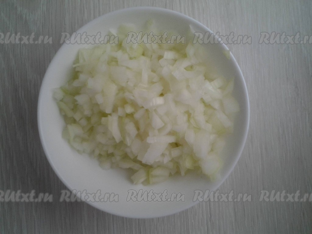 Сначала нарежьте лук. Затем ошпарьте его кипятком, а после этого положите на 10 минут в прохладную воду. Можно в воду с луком добавить немного уксуса, тогда лук станет нежным, а резкий запах и лишняя горечь уйдут.