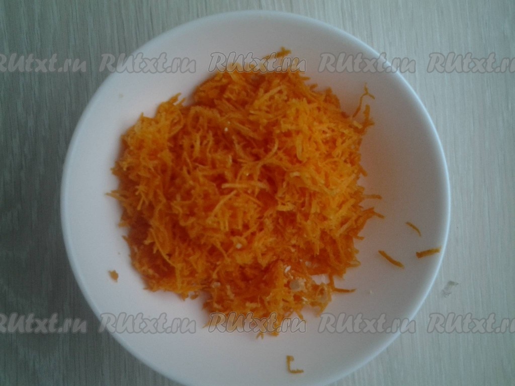 Морковку лучше всего избавить от кожицы не с помощью ножа, а используя металлическую мочалку для мытья посуды. Есть мнение, что возле кожицы много витаминов. Морковь натрите на мелкой терке. Чтобы натёртая морковь была удивительно нежной, раскрыла весь свой букет вкусов и ароматов, нужно ее чуть посолить и чуть посахарить, помять ложкой и оставить на 10 минут.