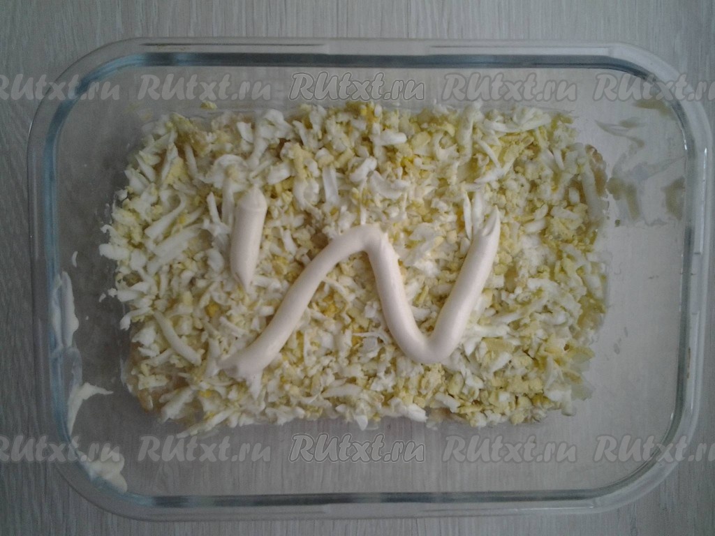 Потом выложите слой яиц, опять смажьте майонезом.