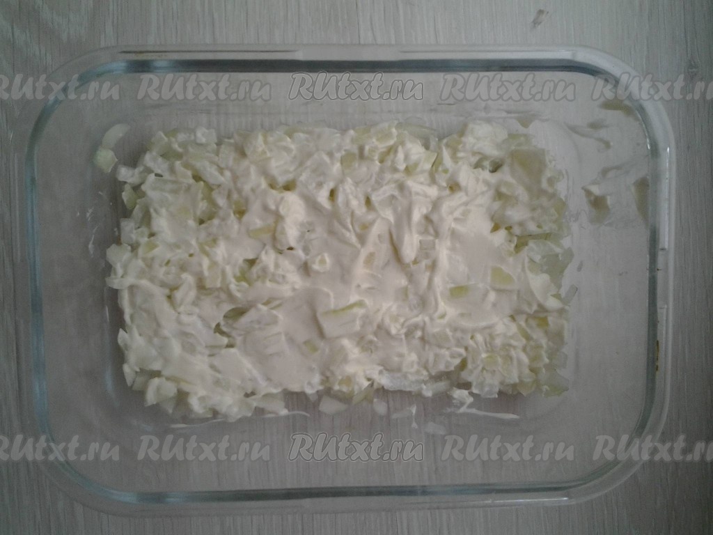 Теперь выложите французский салат слоями, покрывая каждый слой майонезом. Первым слоем выложите отжатый от воды лук, смажьте майонезом.