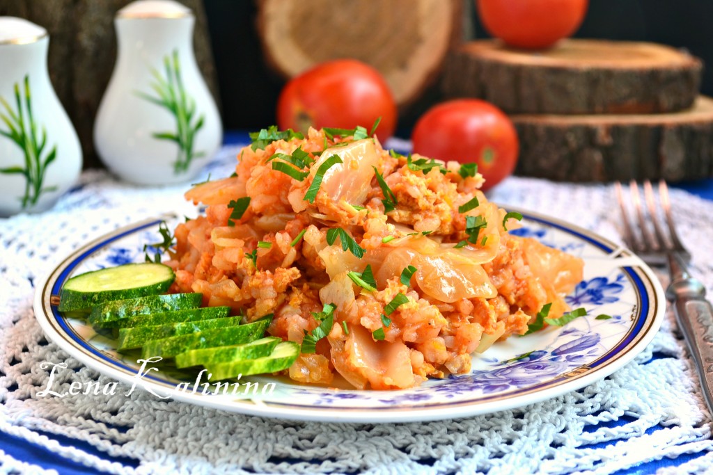 Далее выложить массу из фарша и риса, разровнять.