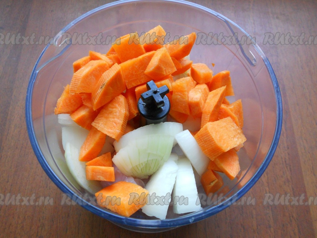 Также к курице в блендер добавить нарезанные лук и морковь, измельчить все вместе. Если фарш покупной, измельчить лук и морковь, а потом добавить к фаршу. Все можно перекрутить на мясорубке.