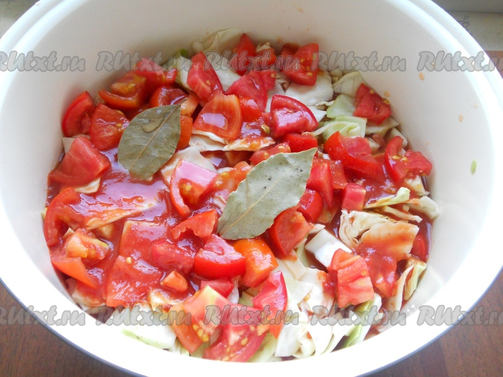 Сверху - оставшуюся капусту, также посолить, посыпать паприкой и выложить оставшиеся помидоры. Добавить томатную пасту, разведенную в воде, и влить оставшуюся воду. Также добавить лавровый лист.