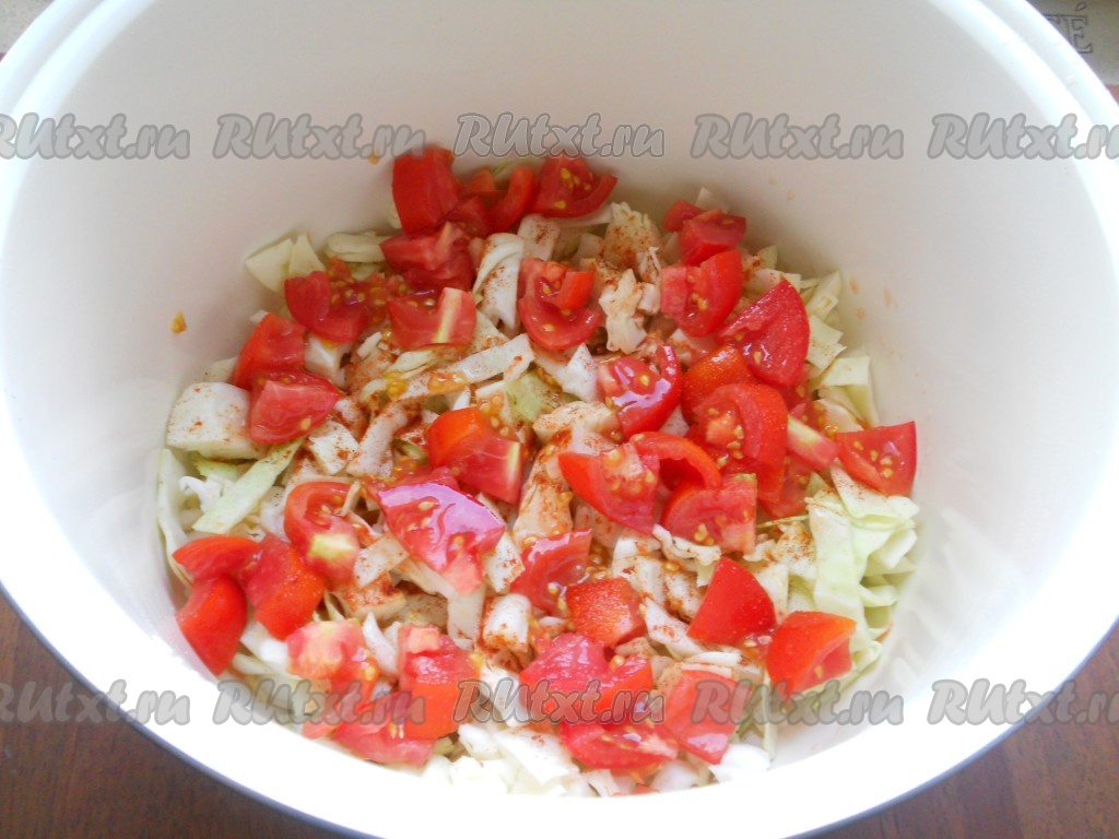 Капусту нарезать небольшими кубиками. Половину капусты поместить в чашу мультиварки, немного посолить, посыпать паприкой. Влить растительное масло.