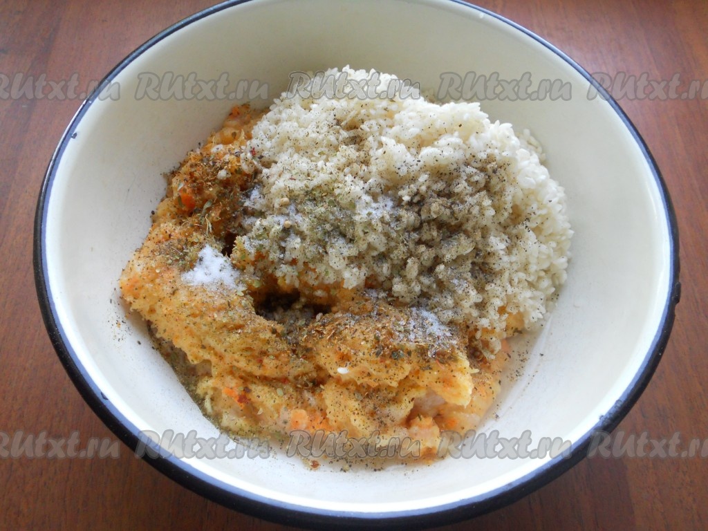 Рис промыть и добавить к фаршу с овощами. Добавить соль, черный молотый перец, специи.