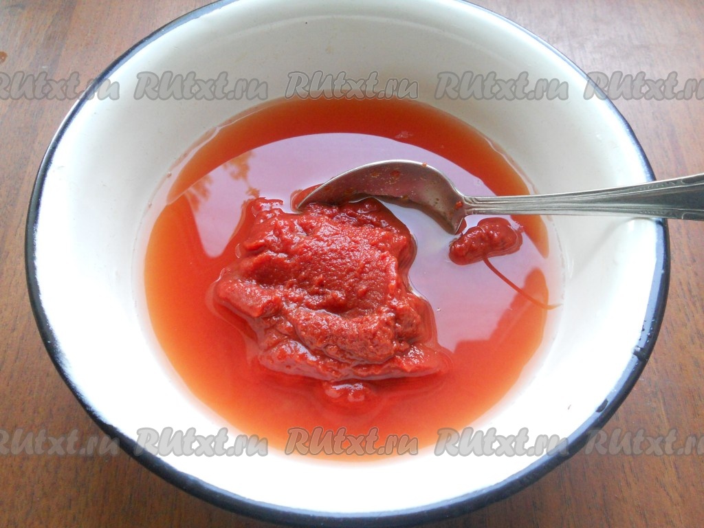 Томатную пасту развести 150 мл воды, посолить немного и всыпать сахар. Перемешать до однородности.