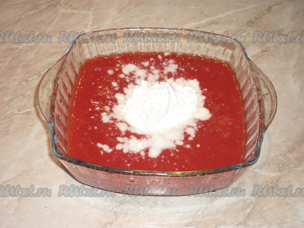 В 1 литр холодного томатного сока (который мы оставляли) всыпать крахмал и хорошо перемешать до однородной консистенции. Томатно-крахмальную смесь вылить в кастрюлю.