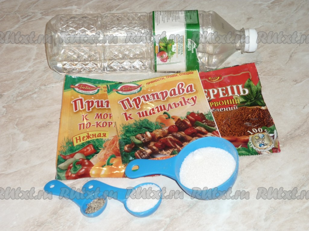 Приготовить приправы к шашлыку и корейской моркови, соль, сахар, чёрный и красный молотые перцы, уксус.