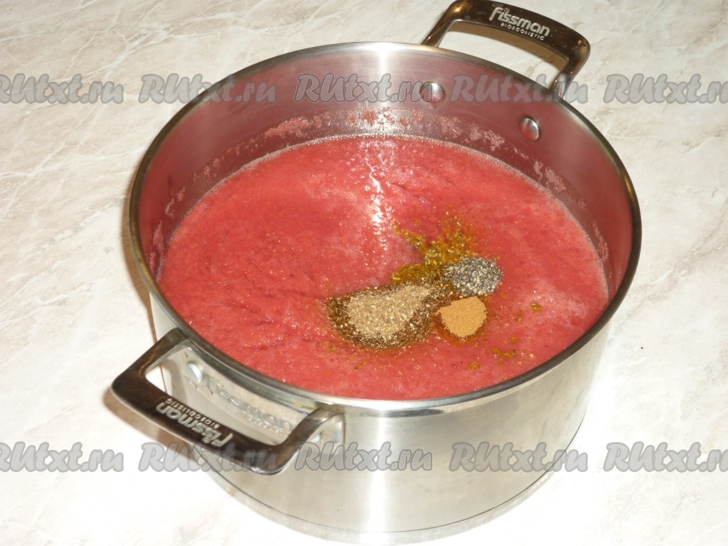 Очищенный чеснок и очищенный от семян болгарский перец пропустить через мясорубку, отправить в кастрюлю с соком и специями, проварить ещё 10 минут.