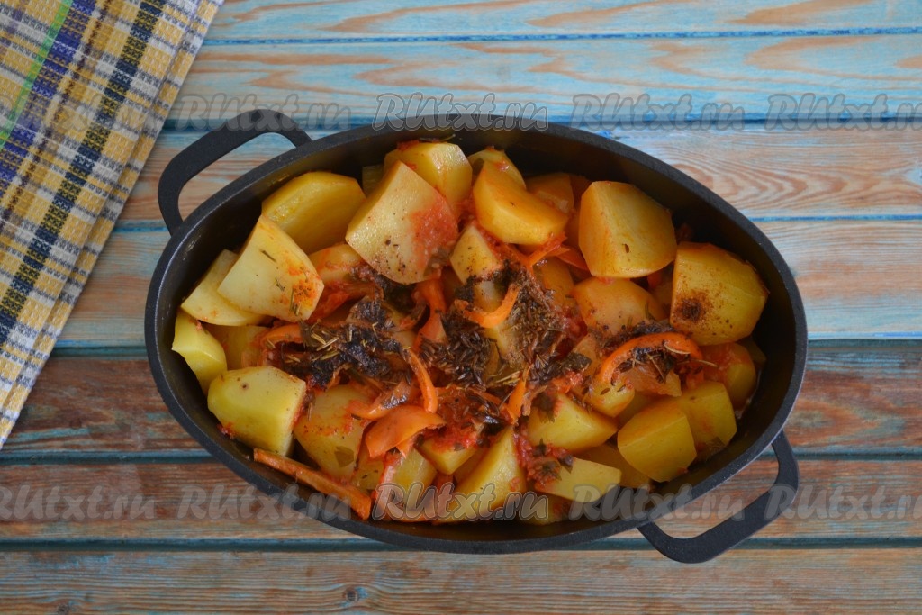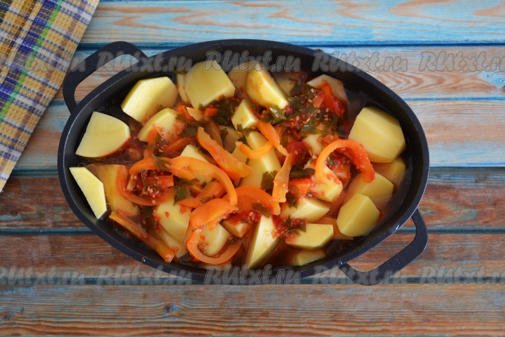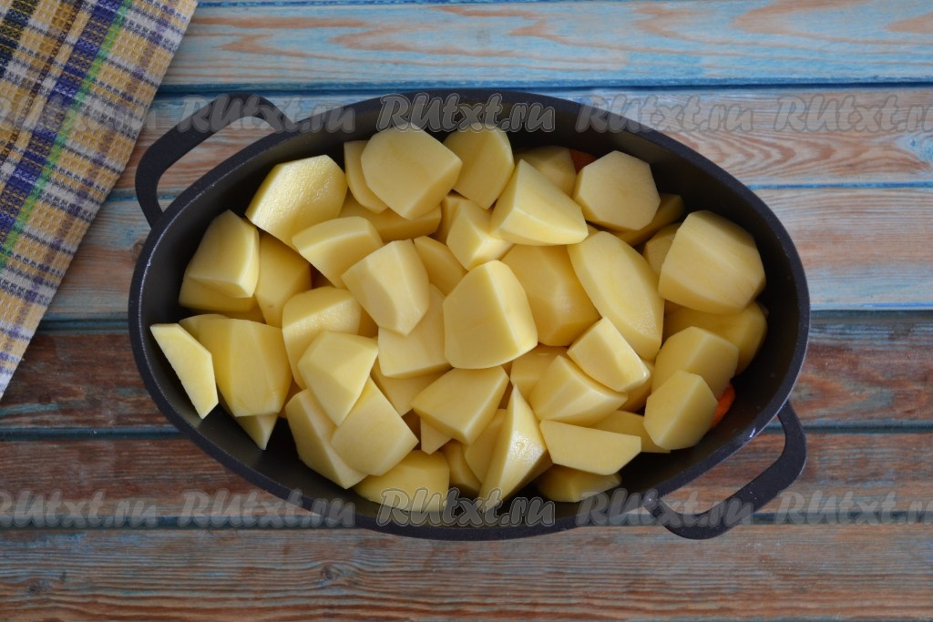 Картофель очистить и нарезать крупными кусочками. Выложить картошку в казан на баранину и овощи.
