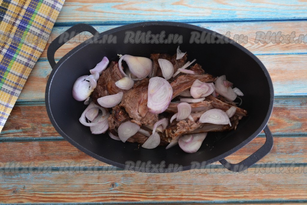 Очистить и нарезать кольцами лук. Выложить лук поверх мяса.