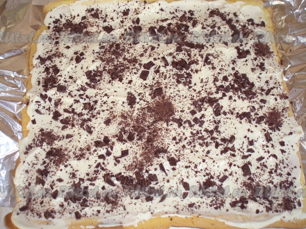 Смазать корж приготовленным кремом. Сверху равномерно посыпать шоколадом.