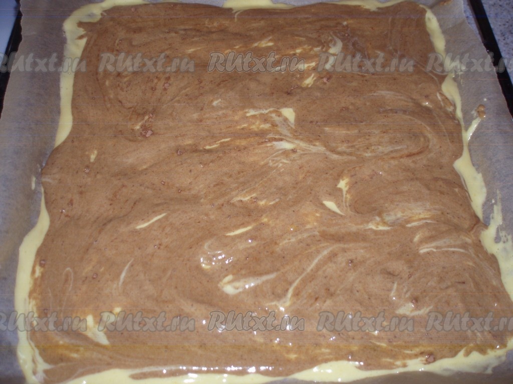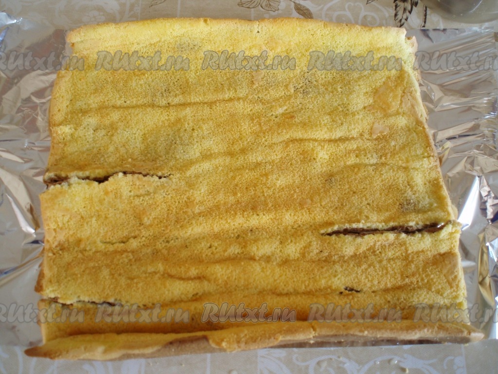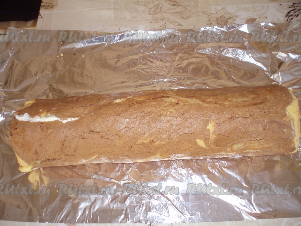 В оставшуюся половину теста добавить какао и перемешать. Тесто с какао выложить на светлое тесто. Форму с тестом поставить в духовку, разогретую до 160 градусов, и выпекать 15-20 минут. Горячий корж выложить на чистое полотенце, быстро снять бумагу для выпечки, свернуть рулетом и охладить.