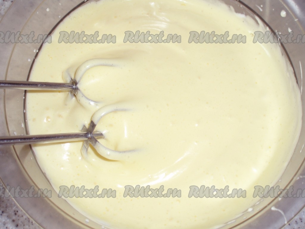 Для приготовления теста отделить белки от желтков. Белки взбить в пену, в конце взбивания постепенно добавить сахар. Затем добавить по 1 желтку, все время взбивая.