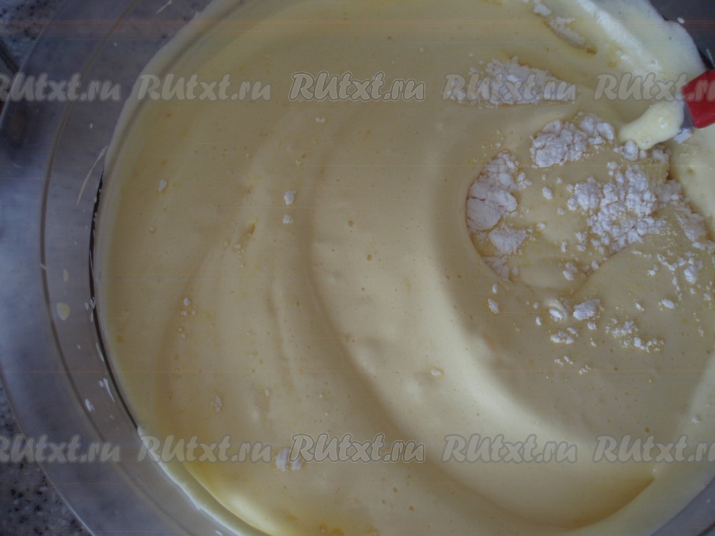Муку просеять с крахмалом и разрыхлителем. Всыпать ее к взбитым яйцам и аккуратно перемешать тесто.