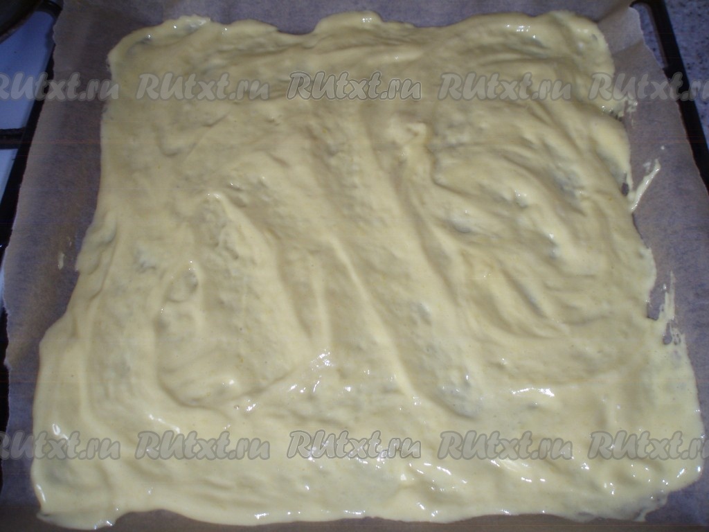 Противень застелить бумагой для выпечки, выложить половину теста.