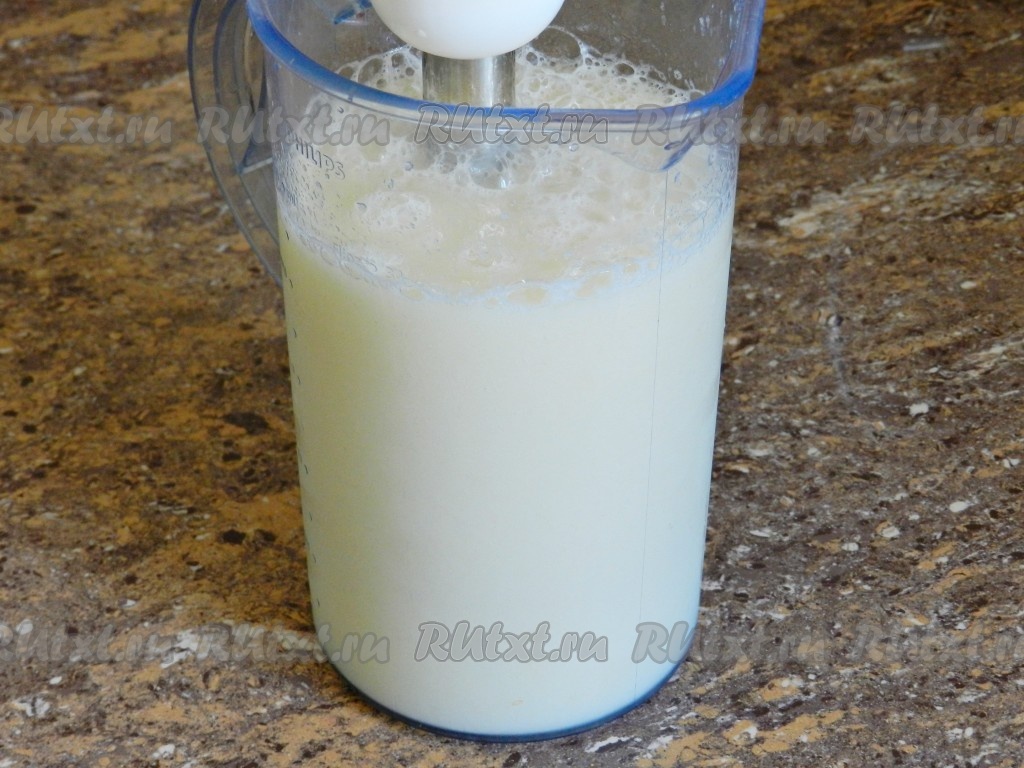Продолжая взбивать, влить сахарный сироп и лимонный сок. Масса должна быть полностью однородной.