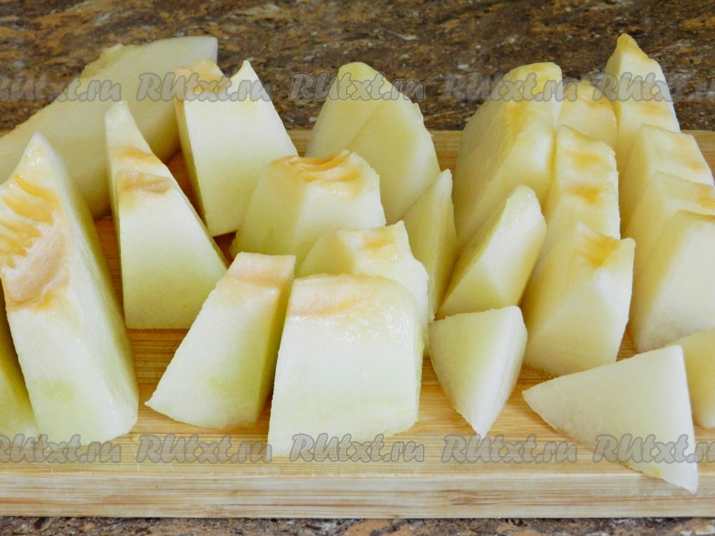 Дыню очистить от кожуры и косточек, нарезать кусочками.