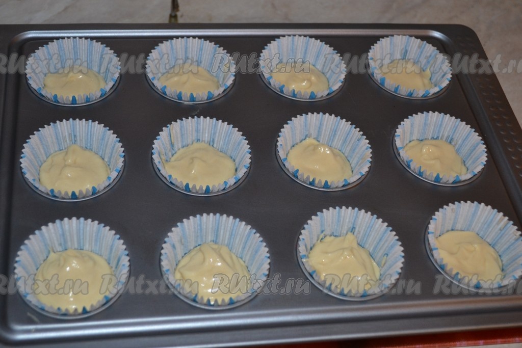 Заполнить формочки тестом на половину (или чуть больше). Не кладите много теста, так как оно очень пышное и будет сильно подниматься.