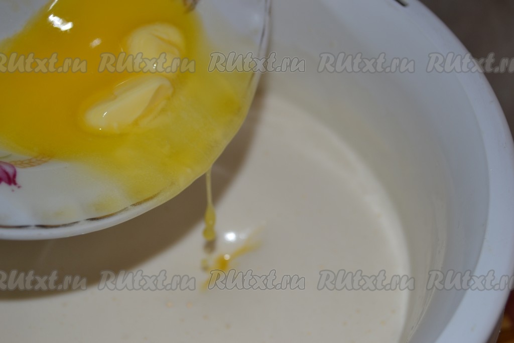 Яйца вбить в достаточно глубокую ёмкость, всыпать сахар, взбить миксером в течение 5-6 минут (масса должна посветлеть и немного увеличиться в объёме). Если нет миксера, можно взбить венчиком до полного растворения крупинок сахара. Слегка растопленное сливочное масло полностью остудить, добавить в яичную смесь, взбить миксером (или венчиком). Влить молоко, перемешать. Если вы используете ароматизатор, то на данном этапе добавить и его тоже.