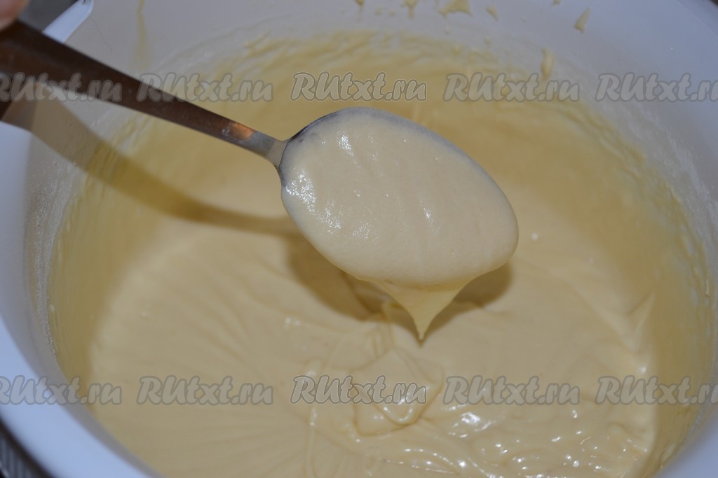 150 грамм муки смешать с разрыхлителем, просеять и частями всыпать в тесто, каждый раз полностью вмешивая муку в тесто. Затем частями начать добавлять оставшиеся 50 грамм просеянной муки, обязательно учитывая густоту теста. Тесто для маффинов, замешанное на сливочном масле, должно получиться, как на фото, напоминающим сметану средней жирности, примерно, как обычное бисквитное тесто.